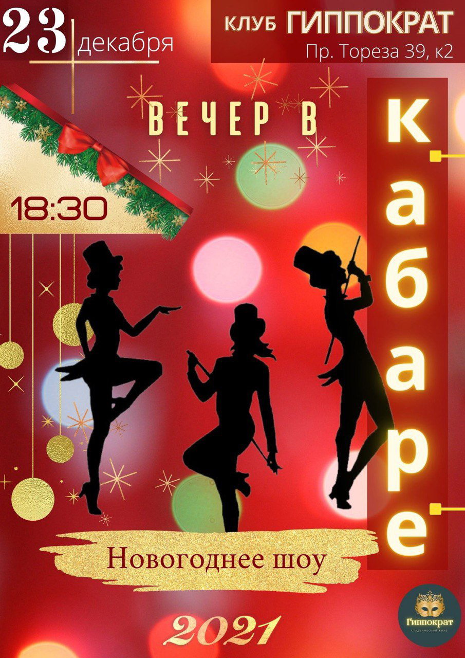 23 декабря творческий клуб «Гиппократ» представит новогоднее шоу «Вечер в кабаре». Мероприятие пройдет по адресу Мориса Тореза 39, к.2 в. 18.30. Приглашаются все желающие!