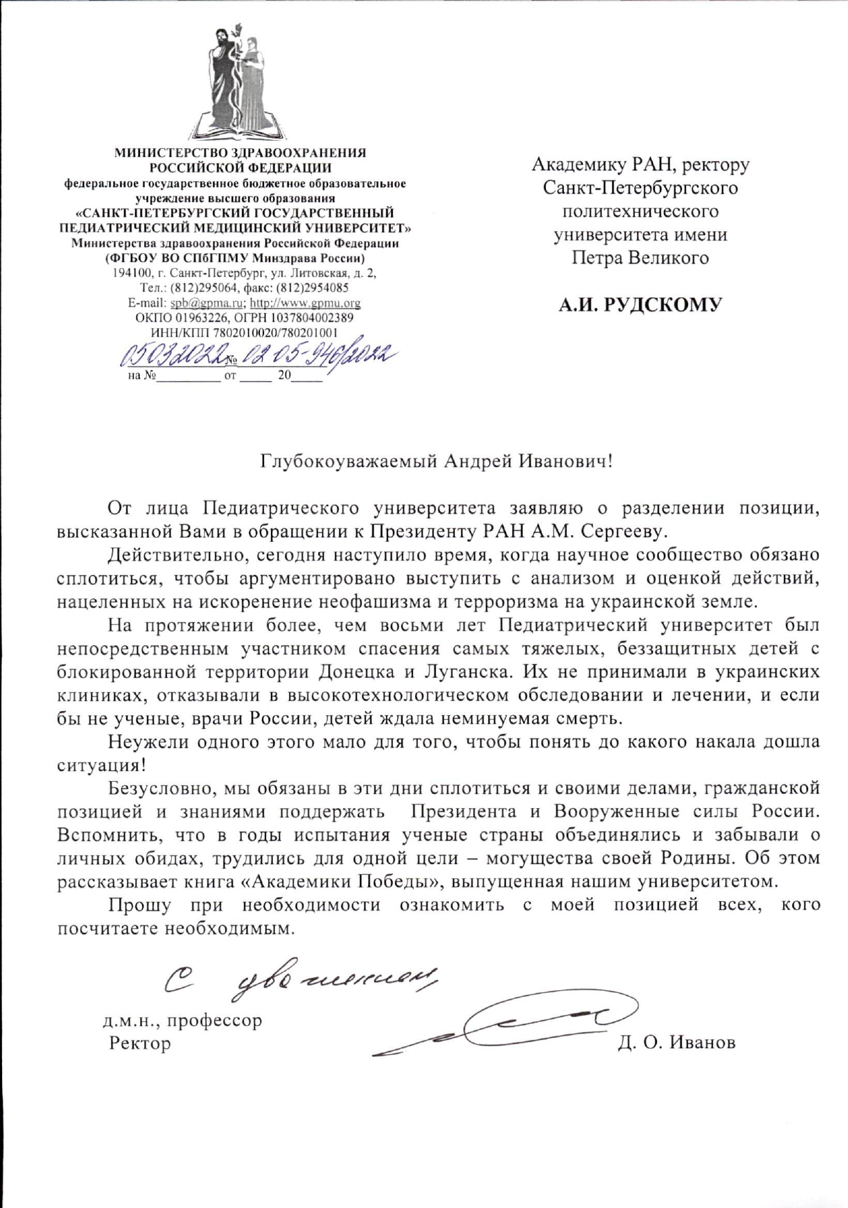 —Действительно, сегодня наступило время, когда научное сообщество обязано сплотиться, чтобы аргументировано выступить с анализом и оценкой действий, нацеленных на искоренение неофашизма и терроризма на украинской земле. На протяжении более, чем восьми лет Педиатрический университет был непосредственным участником спасения самых тяжелых, беззащитных детей с блокированной территории Донецка и Луганска. Их не принимали в украинских клиниках, отказывали в высокотехнологическом обследовании и лечении, и если бы не ученые, врачи России, детей ждала неминуемая смерть. Неужели одного этого мало для того, чтобы понять до какого накала дошла ситуация!, — заявил в письме коллеге Дмитрий Иванов. |