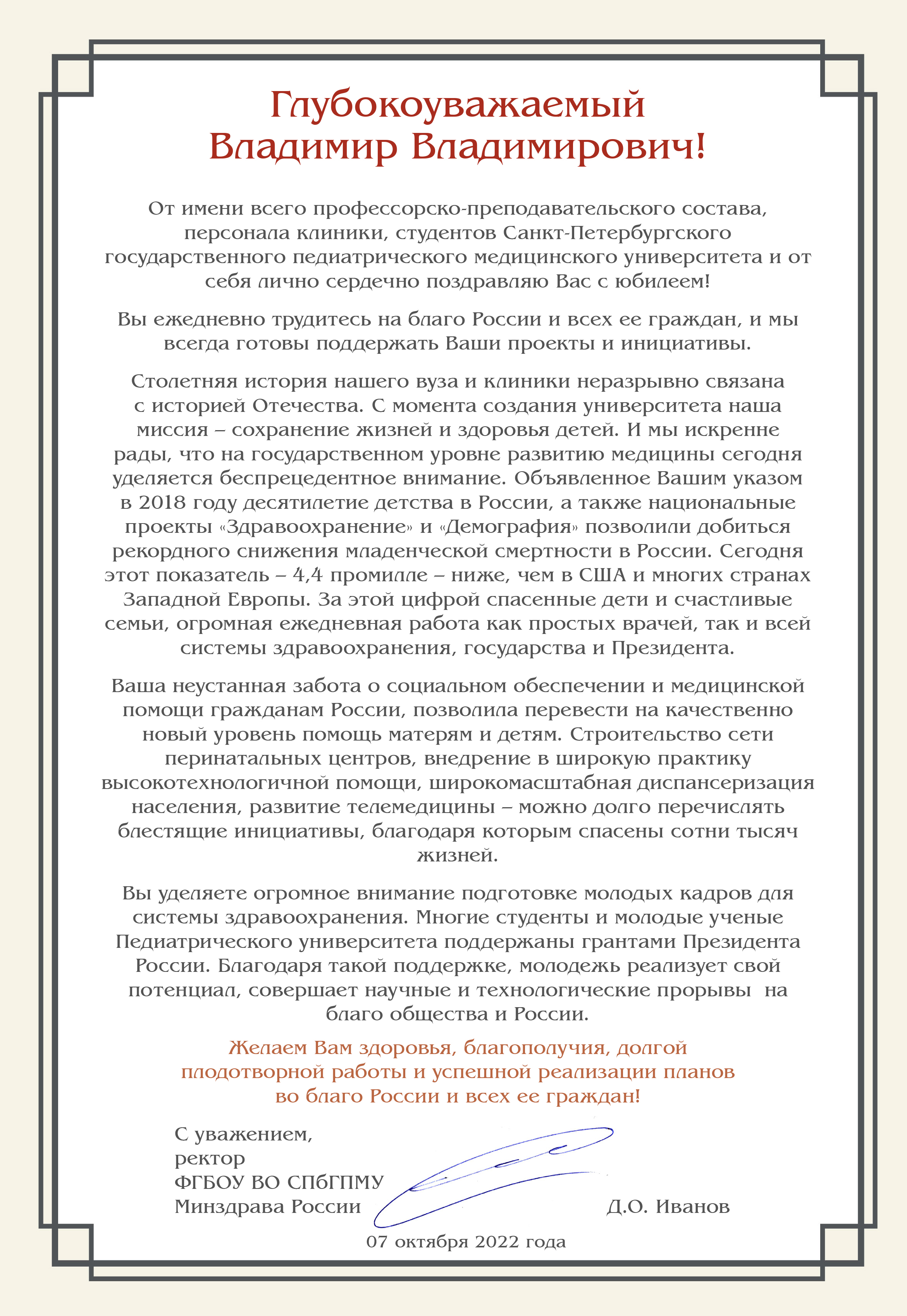 Ректор Санкт-Петербургского государственного педиатрического медицинского университета Дмитрий Иванов поздравляет с Днем защитника Отечества