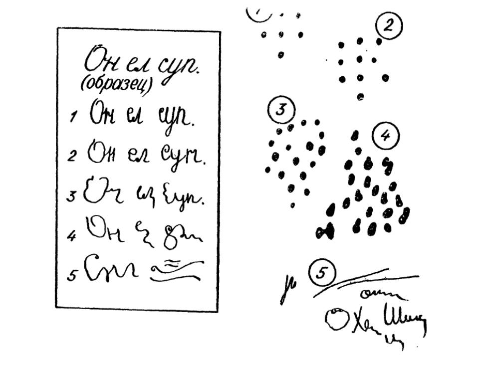 Тест Керна – Ирасека состоит из трех заданий: рисунок человека; срисовывание фразы «Он ел суп» (для этого нужно заранее заготовить карточки размером 7-8 см на 13-14 см с вертикальным размером букв 1 см, а заглавной 1,5 см); срисовывание группы точек диаметром 1 мм с расстоянием между ними 1 см.