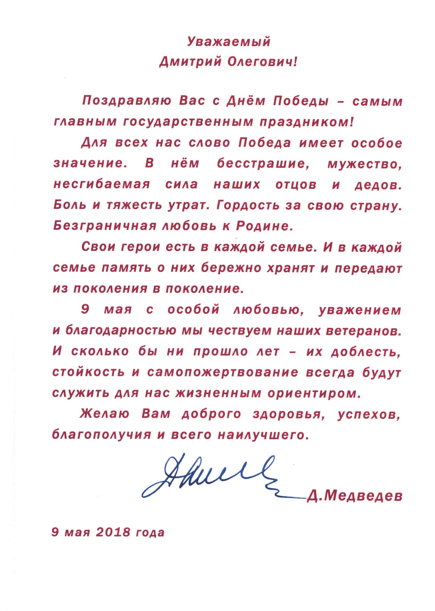 Поздравление Д.А. Медведева с Днем Победы в адрес СПбГПМУ