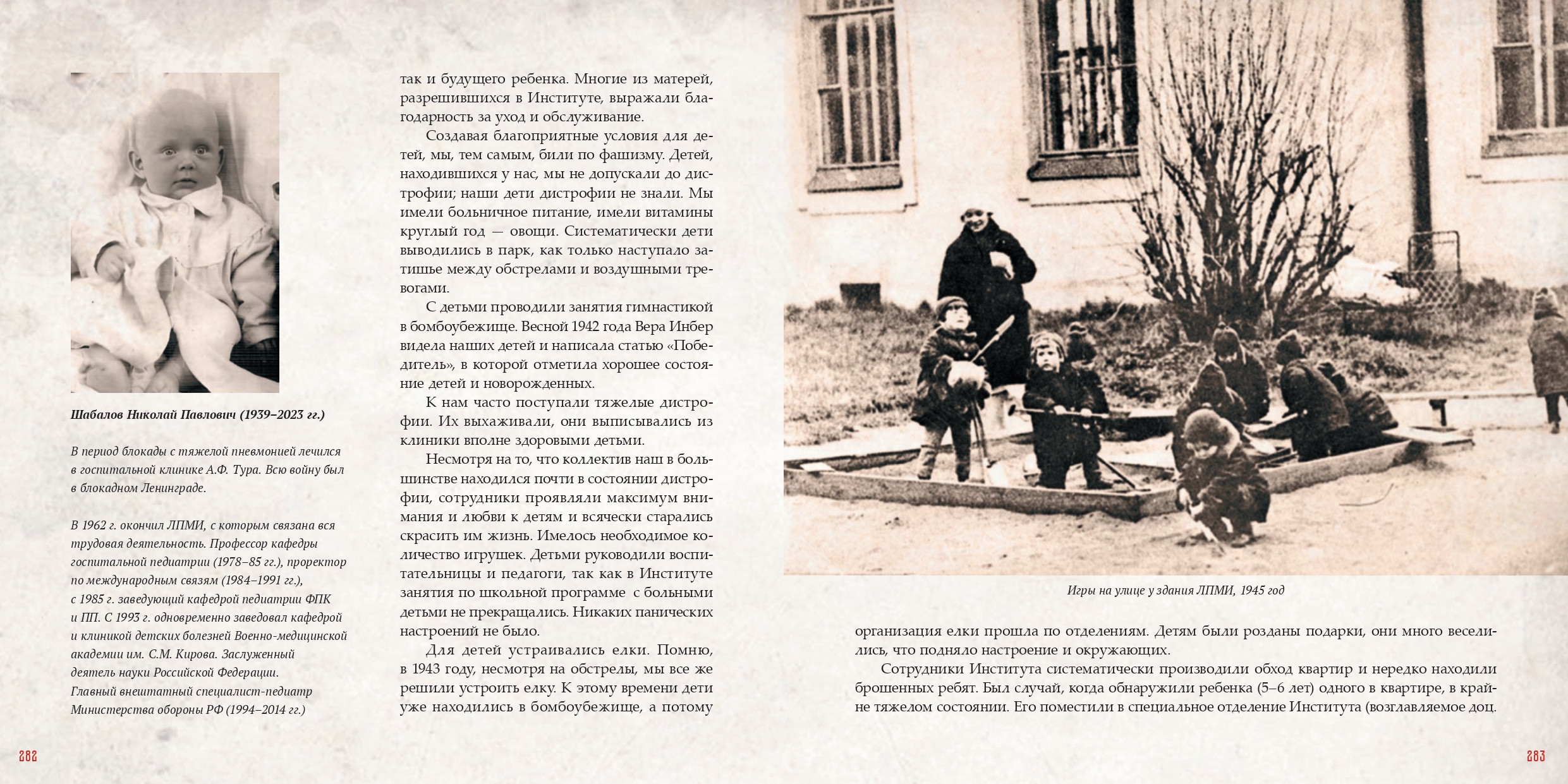 Книга также рассказывает о том, как сотрудники института эвакуировали детей и перемещали отделения в бомбоубежища во время обстрелов. Особенно стоит отметить, что хорошо организованная служба местной противовоздушной обороны в институте позволила избежать жертв среди находившихся на излечении в его клиниках. За все годы блокады от разрыва бомб или пожара не погиб ни один ребенок.