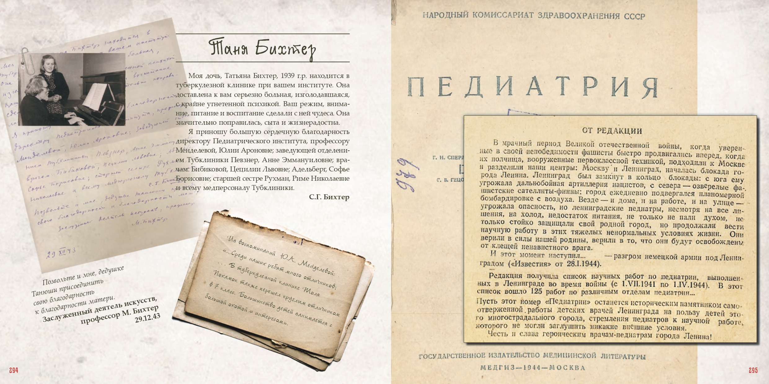 - Моя дочь, Татьяна Бихтер, 1939 г.р., находится в туберкулезной клинике при вашем институте. Она была доставлена к вам серьезно больной, изголодавшейся, с крайне угнетенной психикой. Ваш режим, внимание, питание и воспитание сделали с ней чудеса. Она значительно поправилась, сыта и жизнерадостна. Я приношу большую сердечную благодарность директору Педиатрического института, профессору Менделевой, Юлии Ароновне, – пишет мать Татьяны Бихтер. |