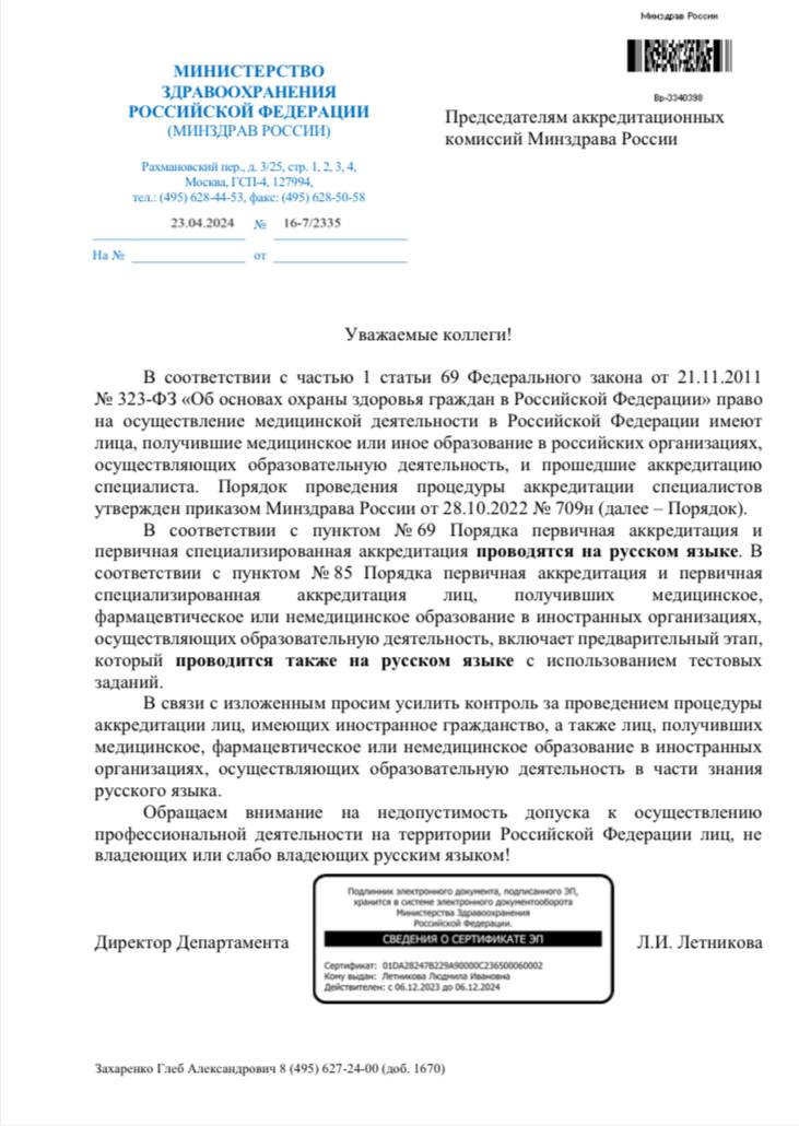 В соответствии со статьей 69 Федерального закона от 21 ноября 2011 г. № 323-ФЗ «Об основах охраны здоровья граждан в Российской Федерации» право на осуществление медицинской деятельности в Российской Федерации имеют лица, получившие медицинское или иное образование в российских организациях, осуществляющих образовательную деятельность, и прошедшие аккредитацию специалиста.
