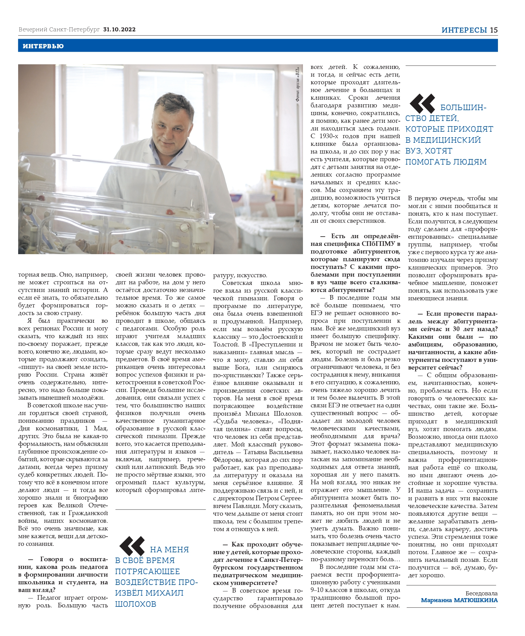 С общим образованием, начитанностью, конечно, проблемы есть. Но если говорить о человеческих качествах, они такие же. Большинство детей, которые приходит в медицинский вуз, хотят помогать людям. Возможно, иногда они плохо представляют медицинскую специальность, поэтому и важна профориентационная работа еще со школы, но ими двигают очень достойные и хорошие чувства. И наша задача — сохранить и развить в них эти высокие человеческие качества. Затем появляются другие вещи — желание зарабатывать деньги, сделать карьеру, достичь успеха. Эти стремления тоже понятны, но они приходят потом. Главное же – сохранить начальный позыв. Если получится – всё, думаю, будет хорошо.