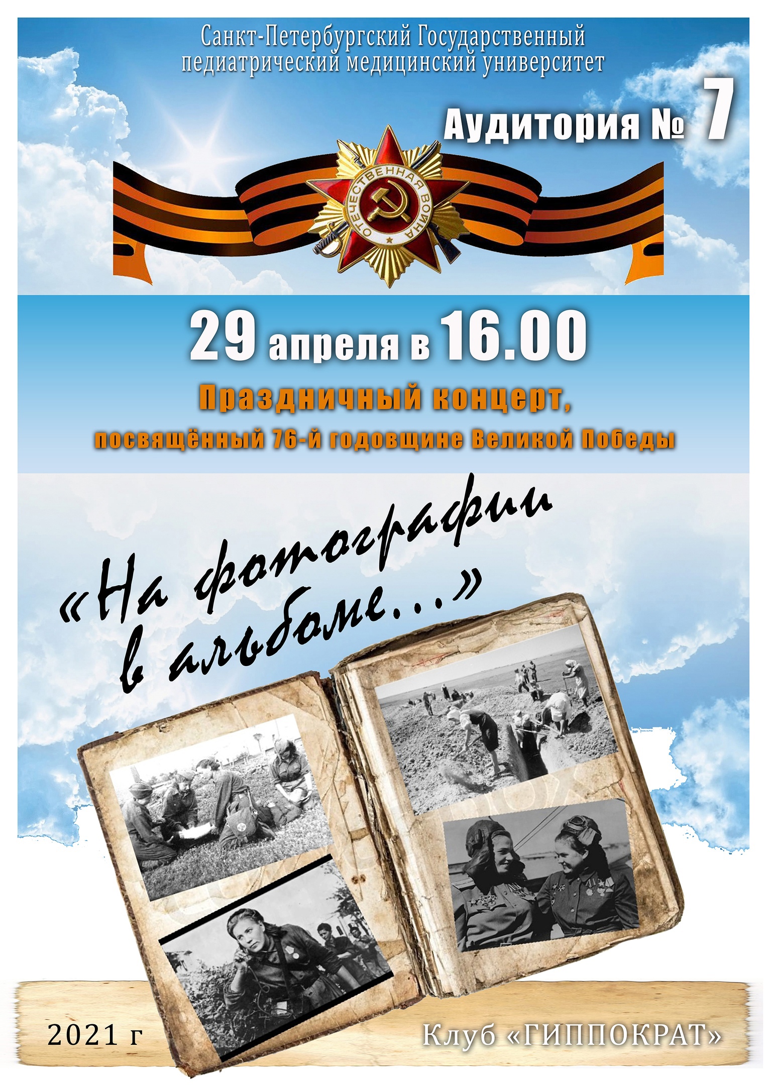 29 апреля в 16:00 состоится праздничный концерт Клуба «Гиппократ» «На фотографии в альбоме...», посвящённый 76-й годовщине Великой Победы.