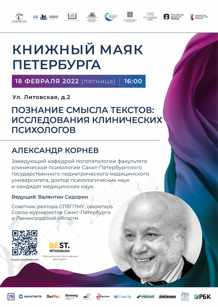 18-20 февраля состоится IV Всероссийский фестиваль «Книжный маяк Петербурга». В рамках фестиваля с лекцией выступит заведующий кафедрой логопатологии СПбГПМУ Александр Корнев.