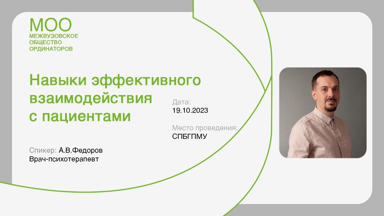 Тема лекции - Навыки эффективного взаимодействия с пациентами. Приглашённый спикер - врач-психотерапевт Алексей Федоров даст рекомендации медицинским работникам по общению с пациентами и их родителям. Лекция будет полезна молодым врачам всех специальностей