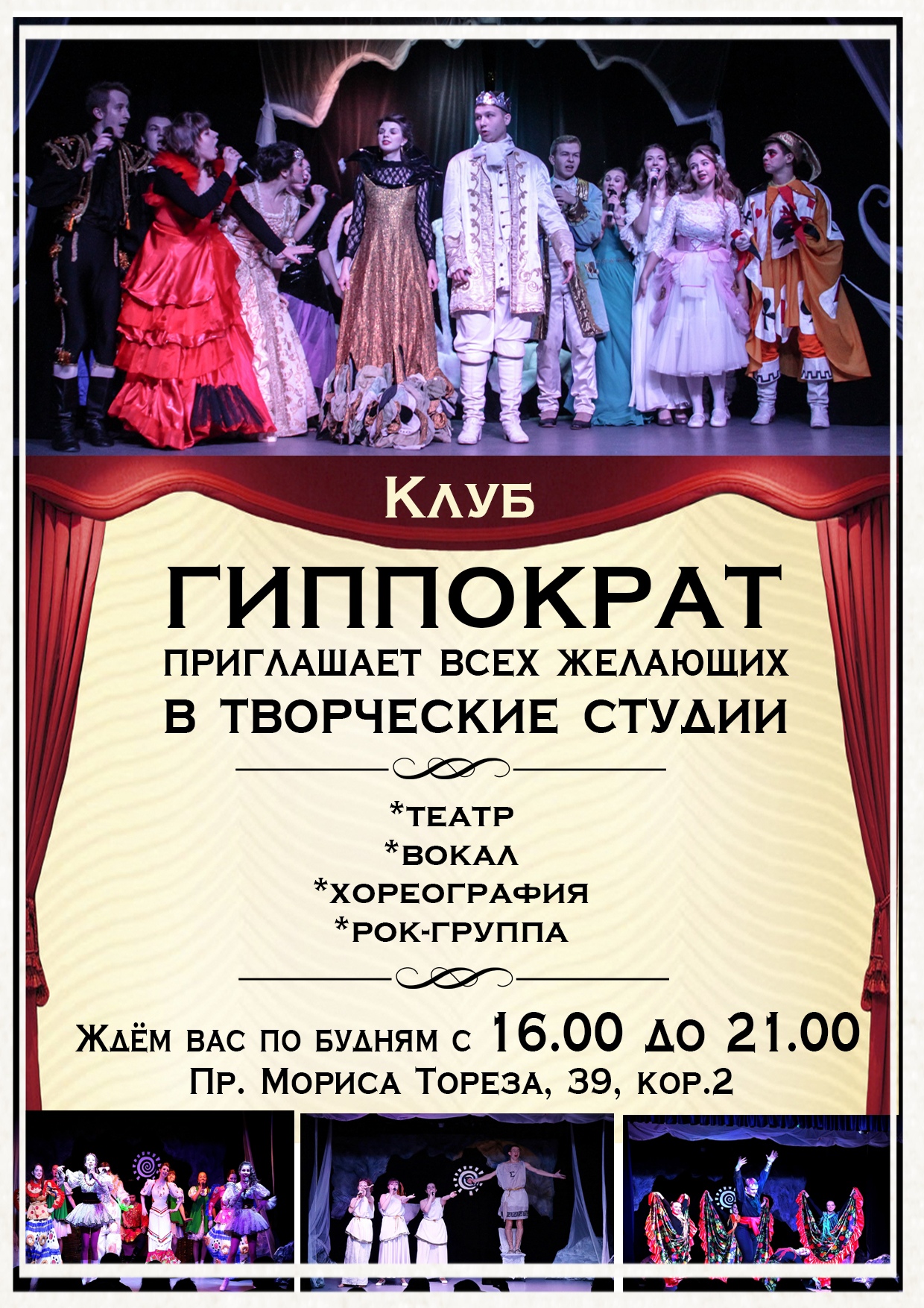 Занятия проводятся по следующим направлениям: театр, вокал, хореография, рок-группа.