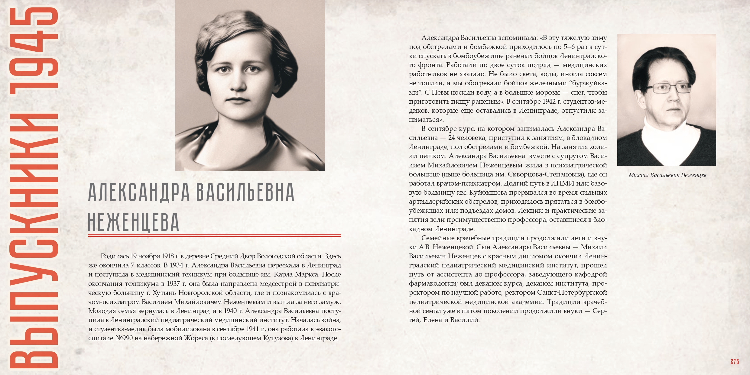 Еще одной героиней книги является Александра Васильевна Неженцева, родившаяся 19 ноября 1918 года в деревне Средний Двор Вологодской области. В 1940 году она поступила в Ленинградский педиатрический медицинский институт. Началась война, и в сентябре 1941 г. студентка-медик была мобилизована. Она работала в эвакогоспитале № 980 на набережной Жореса (ныне – набережная Кутузова) в Ленинграде.