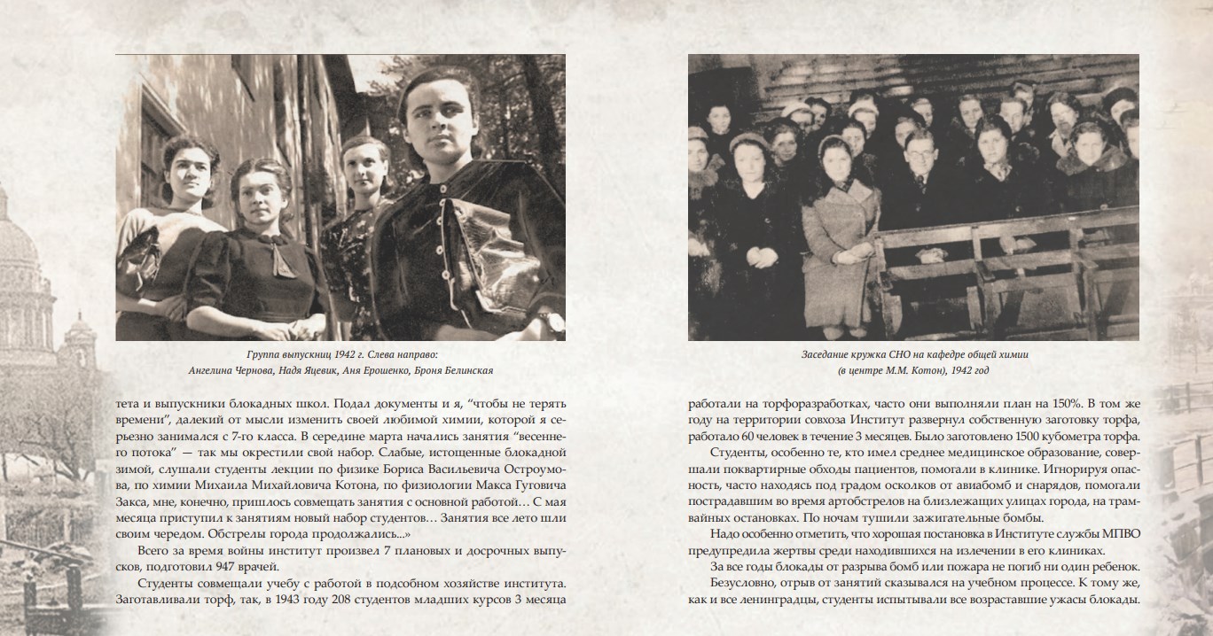 Издание подробно рассказывает о том, как Ленинградский педиатрический медицинский институт продолжал свою работу даже в самые тяжелые времена. Несмотря на постоянные бомбежки и нехватку ресурсов, институт не прекращал своей деятельности ни на один день.