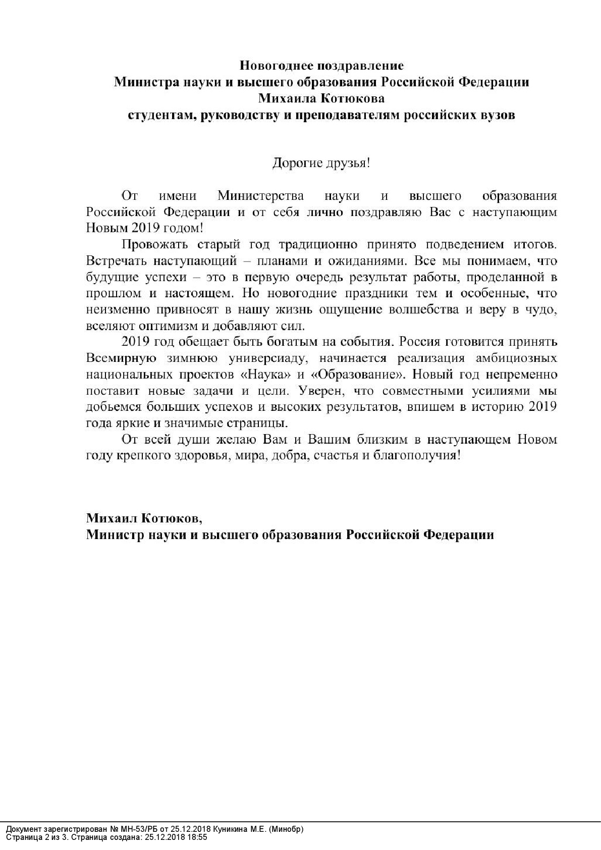 Новогоднее поздравление Министра науки и высшего образования РФ